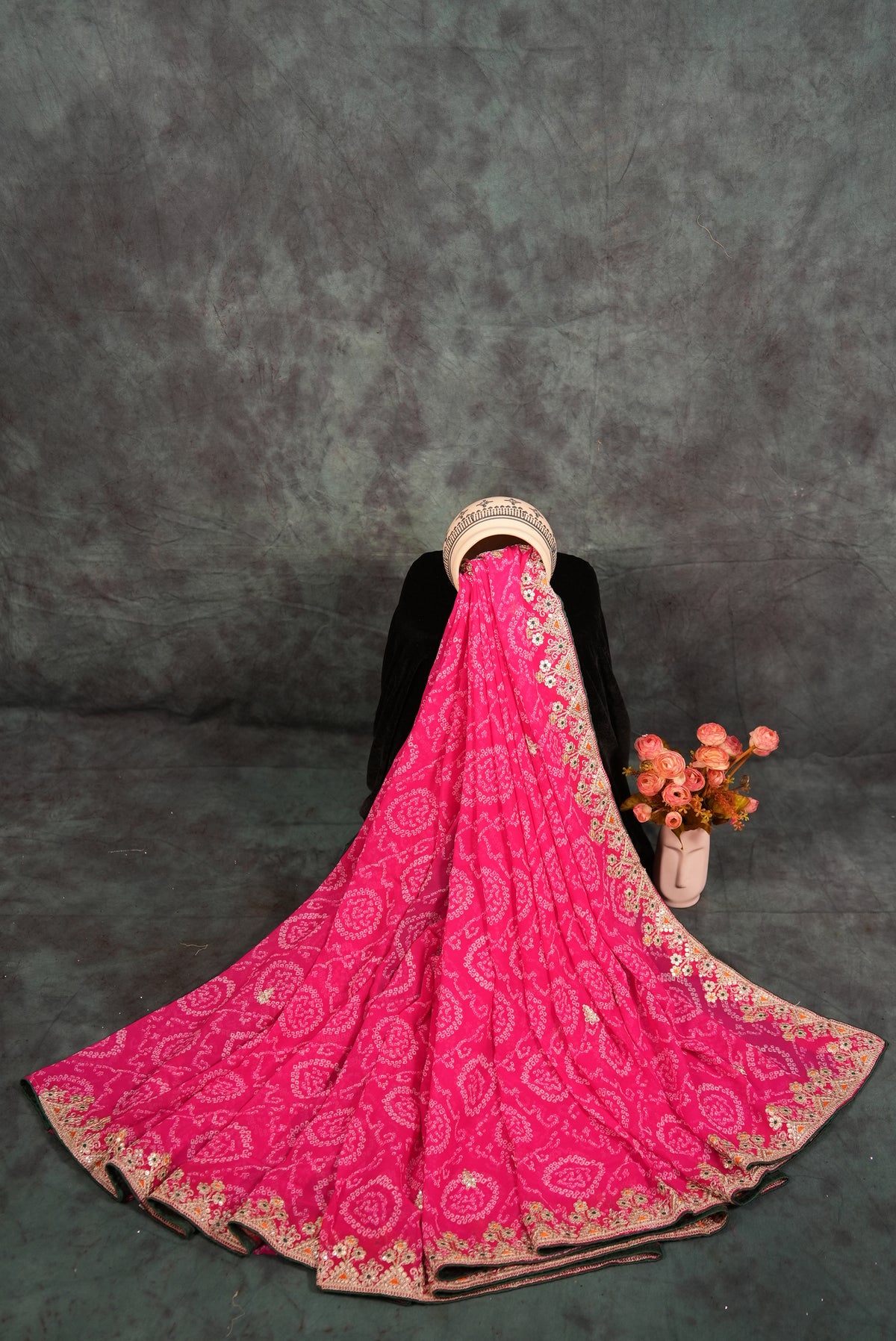 Radiate festive elegance with the vibrant charm of the ISHNA Raktima Bandhej Embroidered Saree. Crafted in a striking pink hue, this saree features intricate Bandhej-inspired patterns that celebrate the timeless beauty of traditional Indian craftsmanship.