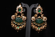 Make a bold and elegant statement with these featuring a beautifully engraved central motif combined with vibrant stones and shimmering kundan drops. The unique blend of ruby, green, blue, and pearl-like accents adds a rich artistic charm to the design.