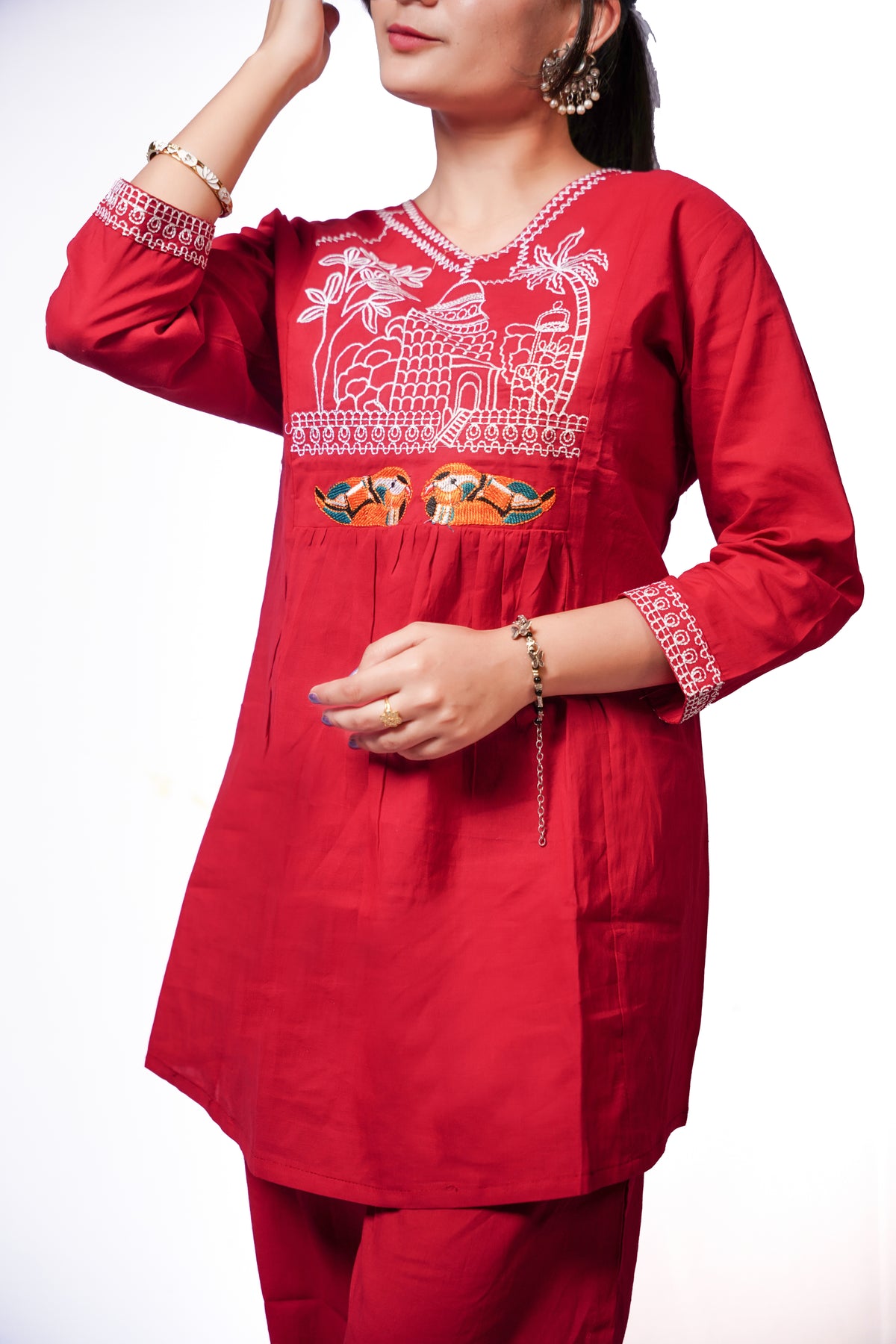Gracefully rooted in traditional artistry, the ISHNA Red Heritage Co-ord Set brings timeless ethnic motifs into a modern, wearable silhouette. Crafted in a rich indigo-blue hue, the top features intricate folk-inspired embroidery depicting architectural and cultural elements, adding depth and character to the design. The detailed neckline and sleeve accents enhance the handcrafted appeal while maintaining a clean, contemporary finish.