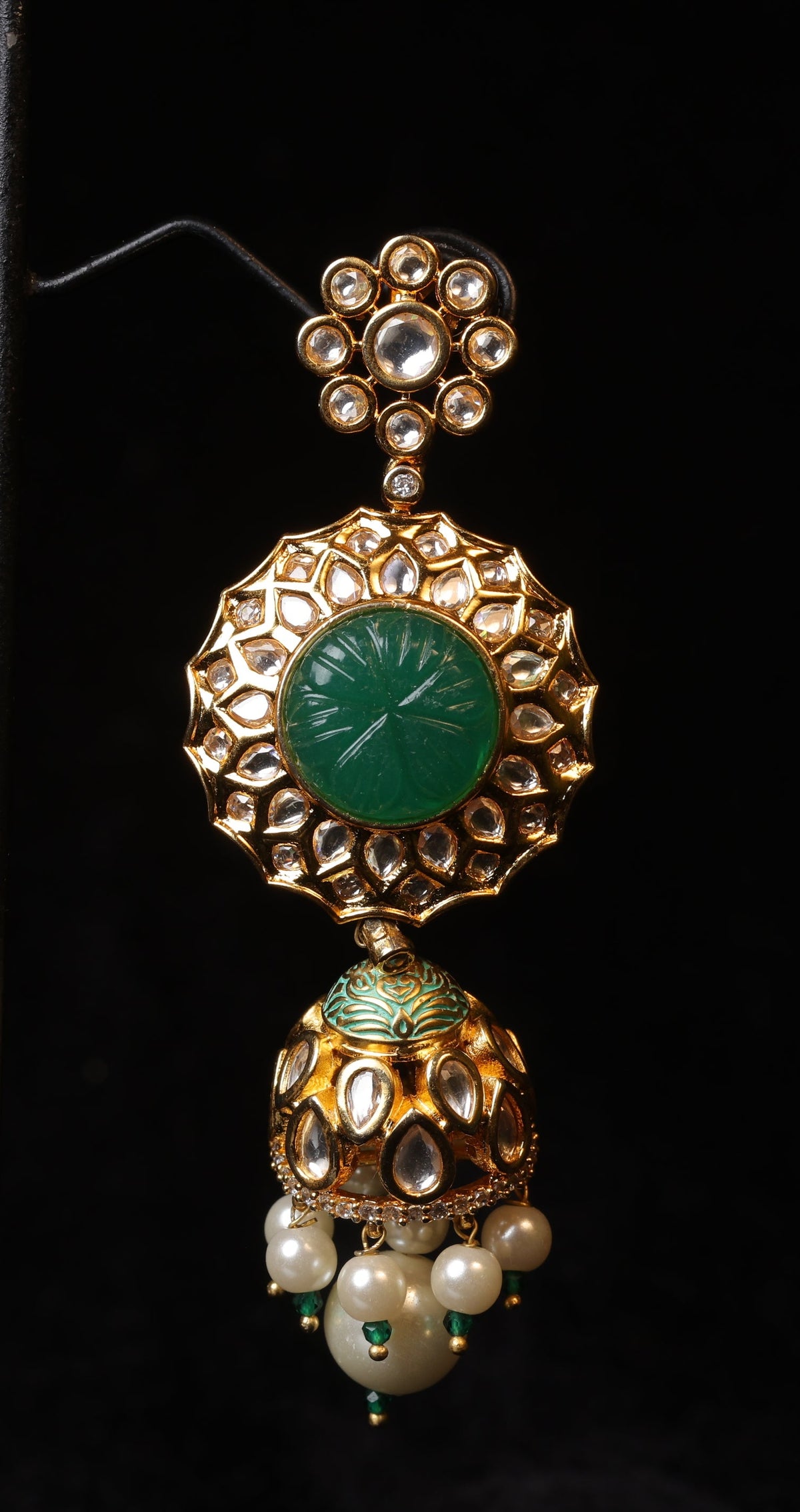 Stones: Emerald-toned centerpiece, kundan stones & pearl droplets
