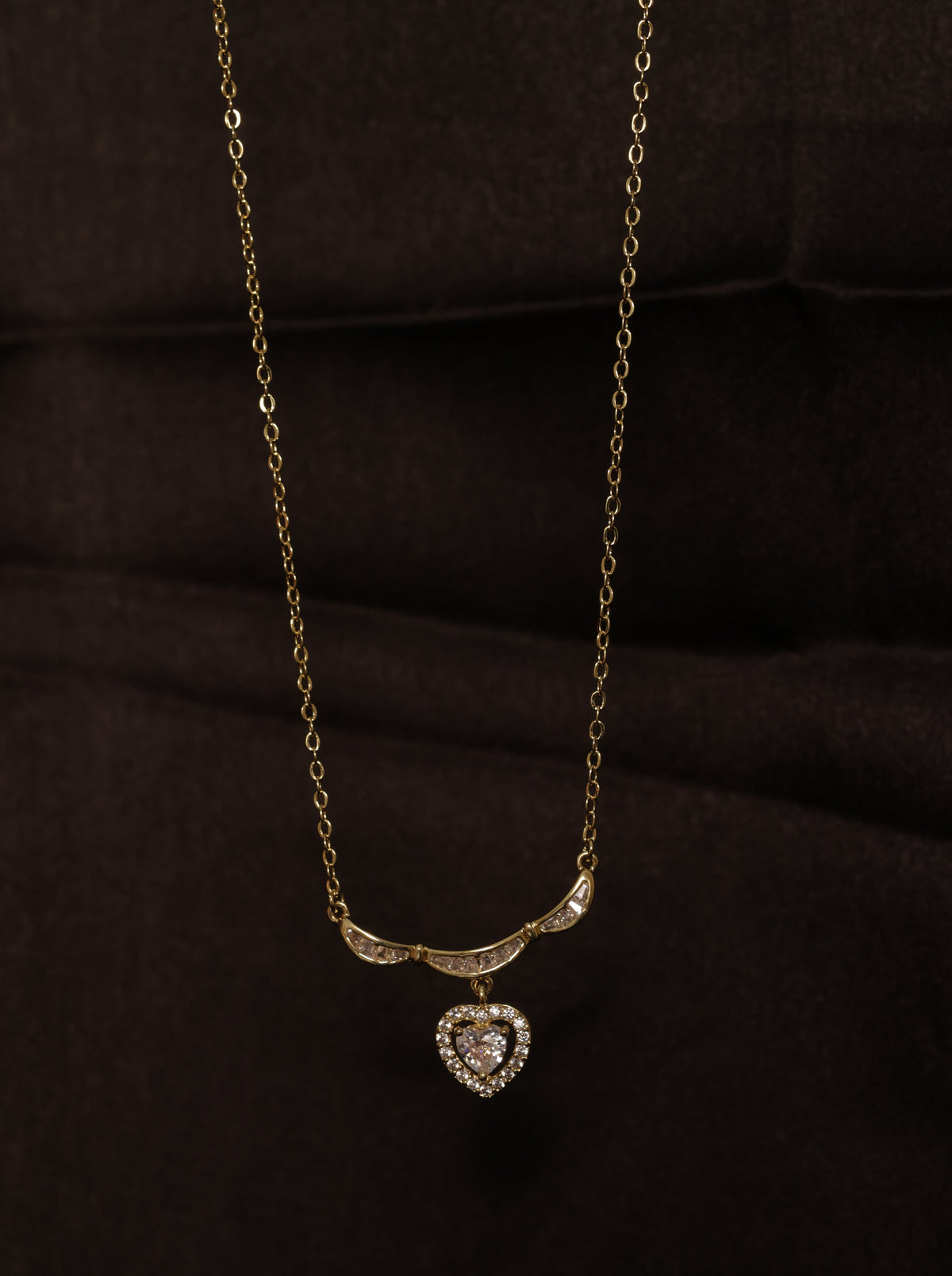 Celebrate love in its most elegant form with the ISHNA Amour Heart Necklace, a timeless piece designed to add a touch of romance to your everyday style. Crafted with a fine gold-toned chain, this necklace features a gently curved crystal-studded bar that leads to a delicate heart-shaped pendant, beautifully encrusted with shimmering stones.