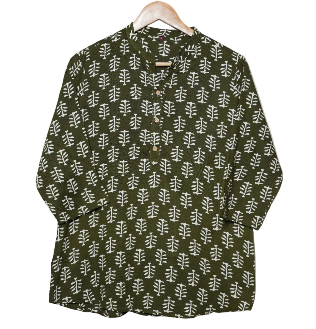 Rooted in earthy elegance, the Aranya Olive Short Kurti is a perfect blend of tradition and everyday ease. Crafted in a deep olive green base, it features classic white Jaipuri leaf motifs arranged in a neat all-over pattern, giving it a calm yet distinctive ethnic appeal.
