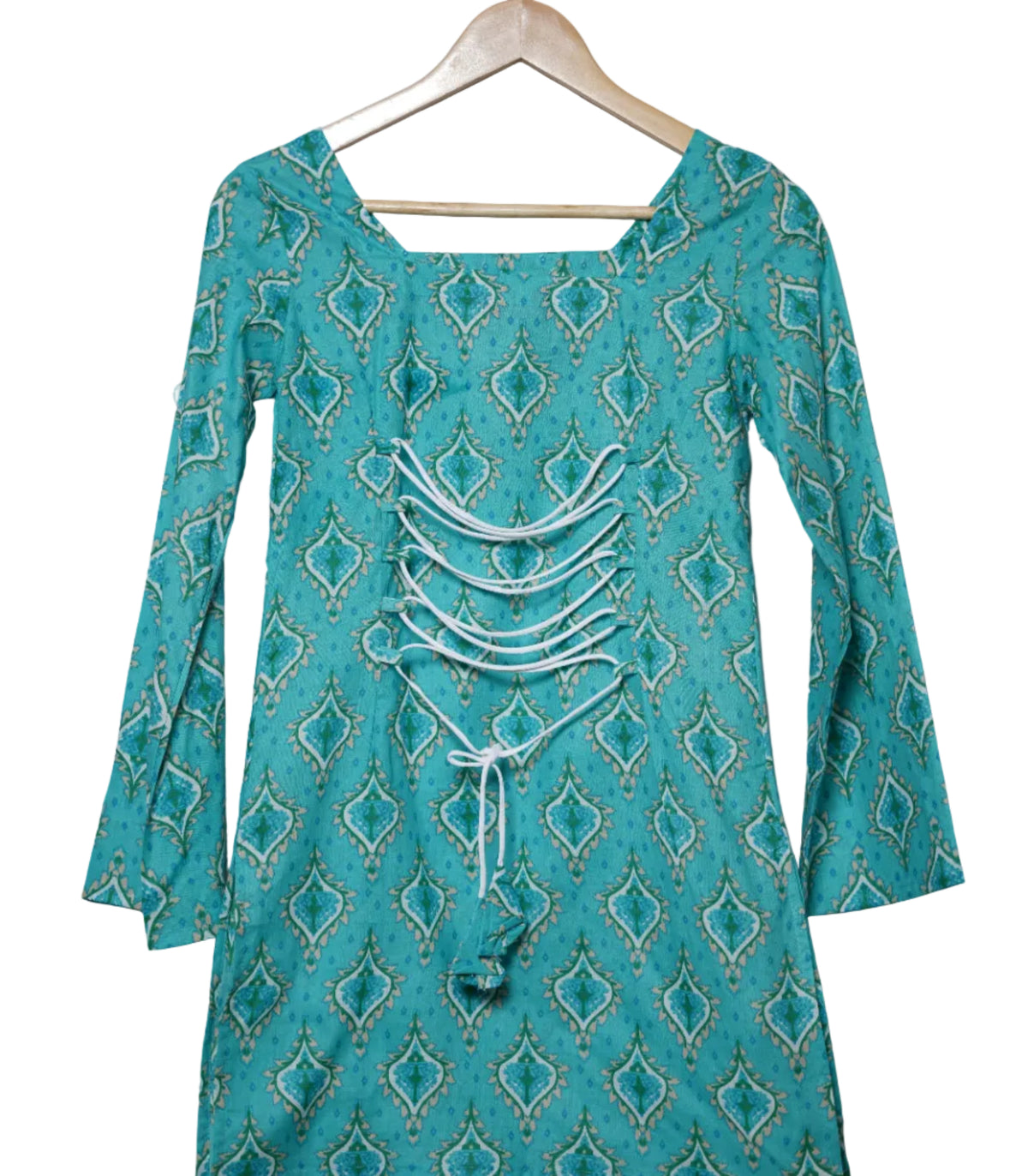 Bright and effortlessly elegant, the Firoza Teal Short Kurti brings a refreshing charm to your everyday ethnic wardrobe. Designed on a soothing teal base, it features intricate all-over Jaipuri geometric motifs in subtle contrasting tones, creating a refined yet eye-catching look.