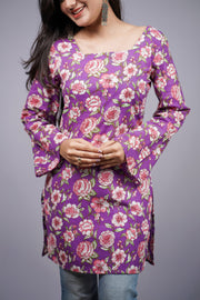 Bright, graceful, and rooted in tradition, the Gulnaar Purple Floral Short Kurti brings classic floral charm to everyday ethnic wear. Set on a rich purple base, the kurti is adorned with all-over handblock-inspired floral motifs in soft pink and ivory tones, creating a vibrant yet balanced look.