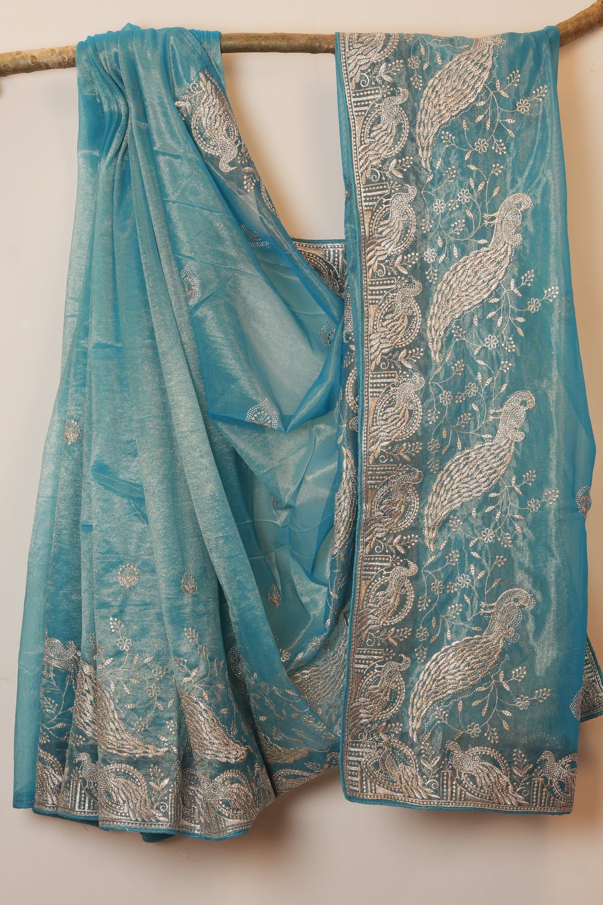 Step into serene elegance with this dreamy Crystal Blue organza saree, a perfect blend of softness and refined artistry. The saree showcases delicate floral embroidery gracefully scattered across the body, adding texture and charm while preserving the light, airy feel of the fabric.