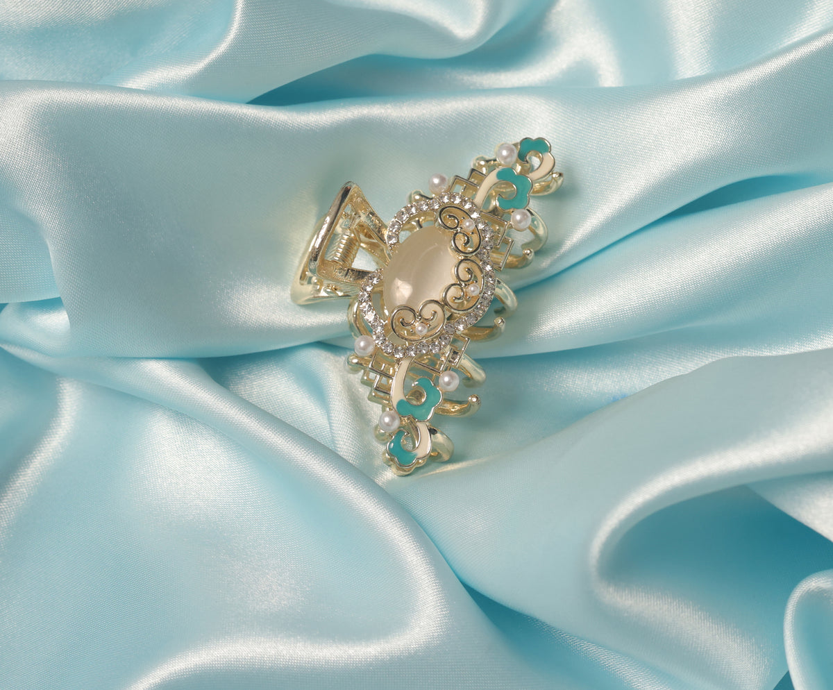 Soft aqua enamel motifs on the sides add a fresh, dreamy touch, making this hair claw perfect for those who love sophisticated accessories with a hint of charm. Lightweight yet sturdy, it offers a strong grip that holds your hair effortlessly while adding a luxe highlight to any outfit.