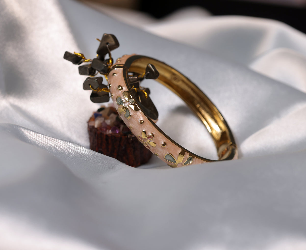 Elevate your elegance with the Blush Bloom Enamel Bracelet from ISHNA. Crafted for women who adore subtle luxury, this bracelet features a soft blush–pink enamel finish beautifully accented with delicate gold floral motifs. Its feminine design and refined detailing create a graceful aesthetic that transitions effortlessly from festive wear to everyday sophistication.