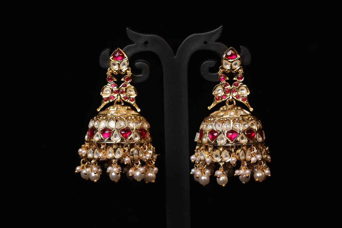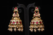 Each jhumka is beautifully layered with detailed motifs, culminating in a cascade of delicate pearl droplets that add graceful movement and grandeur. The exquisite detailing and royal color palette make this pair a perfect choice for weddings, festivals, and cultural celebrations.