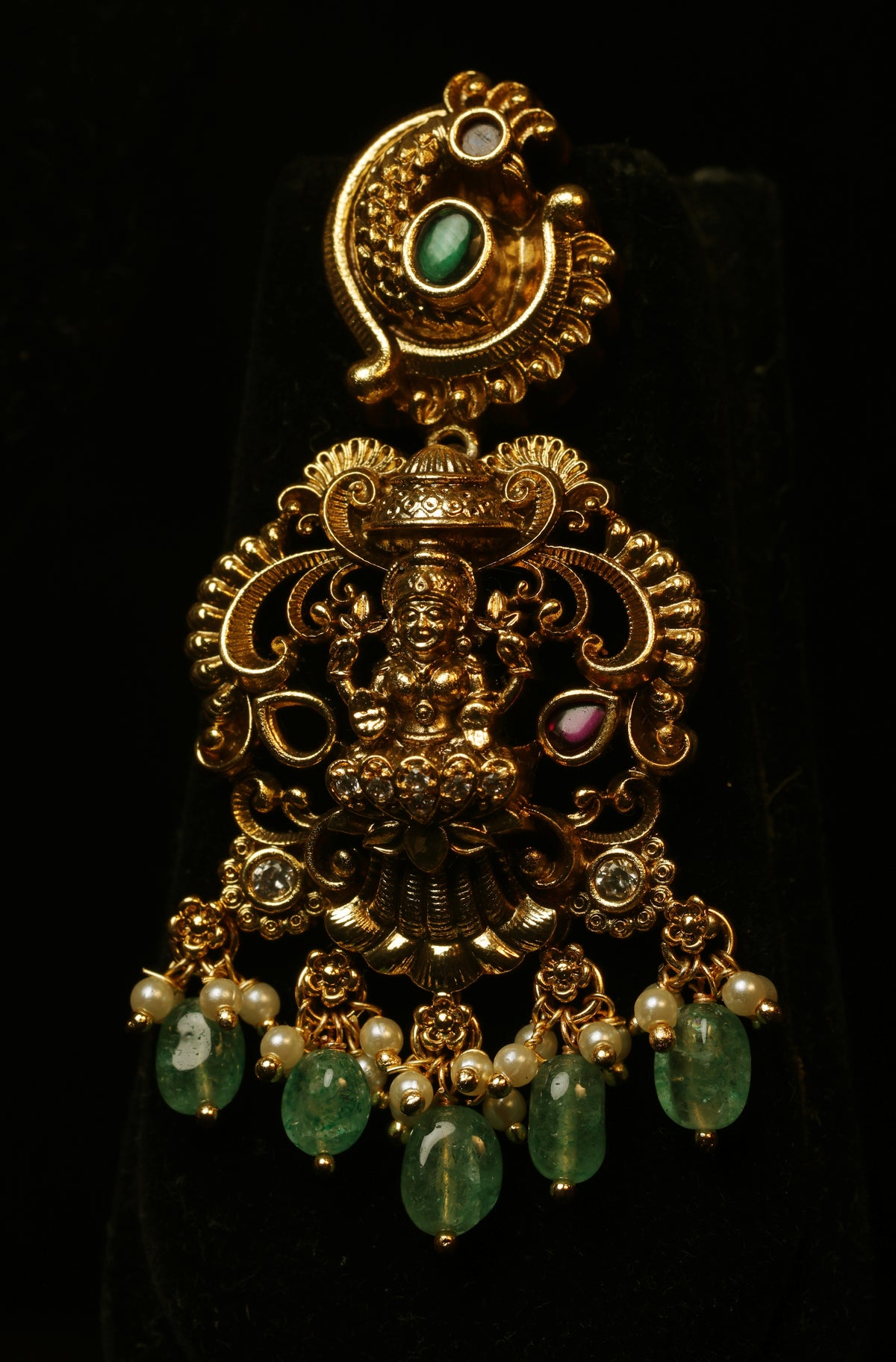 Invoke the essence of divine grandeur with the. This exquisite creation showcases Goddess Lakshmi seated majestically on a lotus, symbolizing prosperity and abundance. The antique gold-plated pendant is adorned with intricately carved motifs, surrounded by vibrant ruby and emerald-toned stones that illuminate its divine aura.
