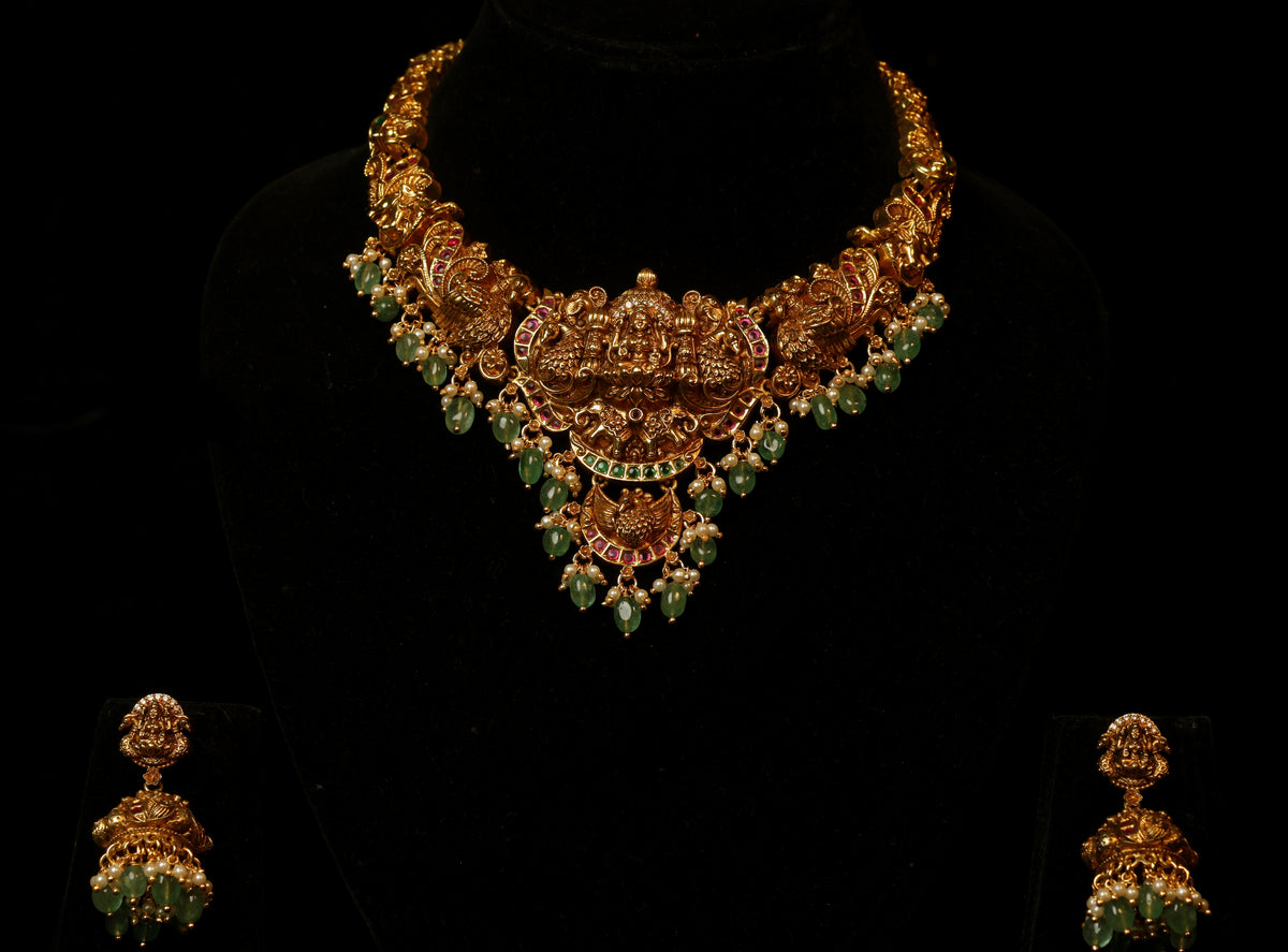 The antique gold finish enhances its vintage elegance, making it the perfect statement piece for weddings, festive celebrations, and cultural occasions. Designed with fine artistry and attention to detail, this jewellery set complements any ethnic outfit and reflects the timeless beauty of South Indian craftsmanship.