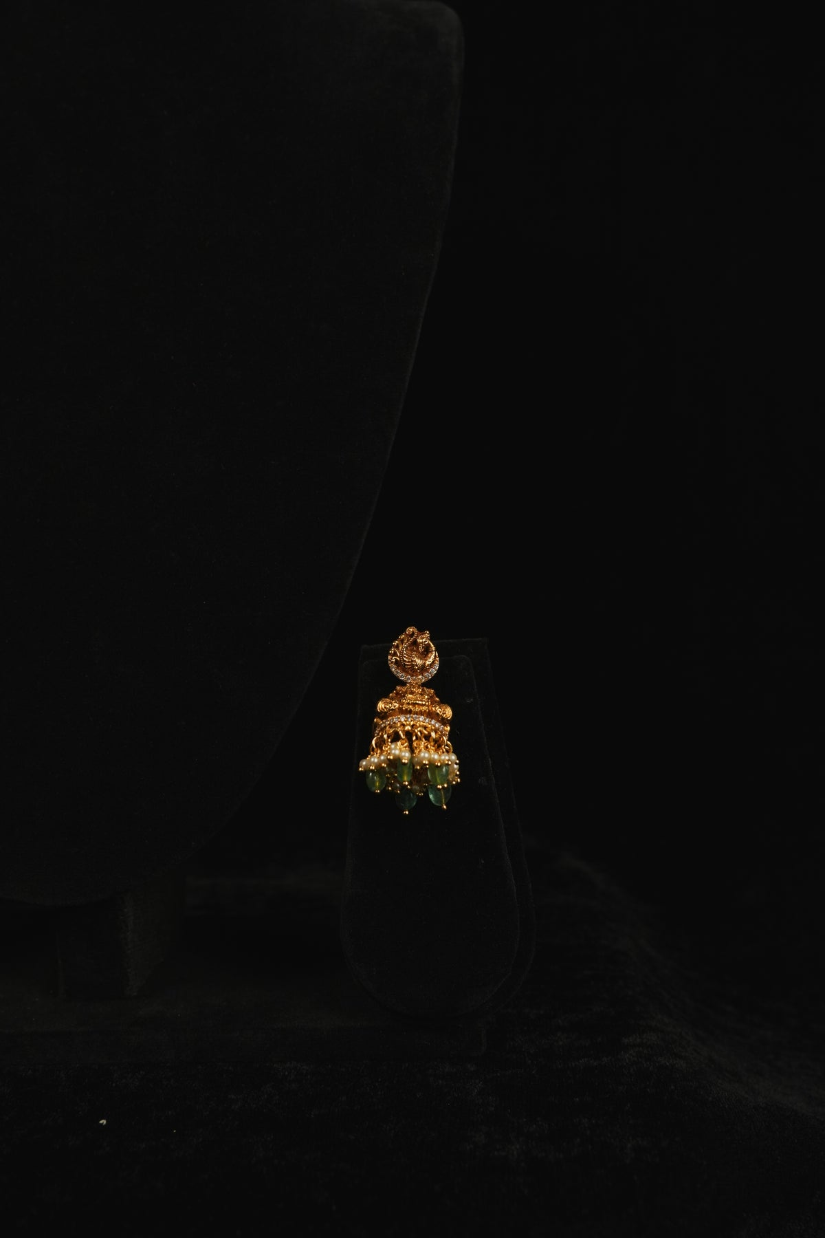 The antique gold finish highlights the intricate carvings, while the hanging bead drops add graceful movement. Paired with matching jhumka earrings, this set is perfect for festive occasions, weddings, poojas, and cultural celebrations.