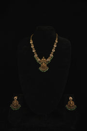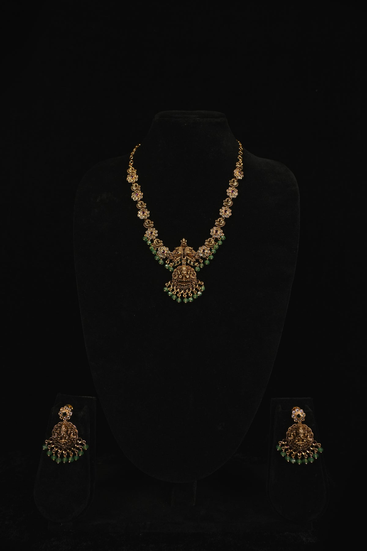The antique gold finish highlights the intricate carvings, while the hanging bead drops add graceful movement. Paired with matching jhumka earrings, this set is perfect for festive occasions, weddings, poojas, and cultural celebrations.