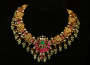 The necklace features multiple strands of emerald-green beads and ruby stones enhanced with traditional gold detailing, seamlessly blending opulence with sacred artistry. Accompanied by matching jhumkas, this masterpiece captures the timeless spirit of South Indian temple heritage — a perfect adornment for brides and festive celebrations.