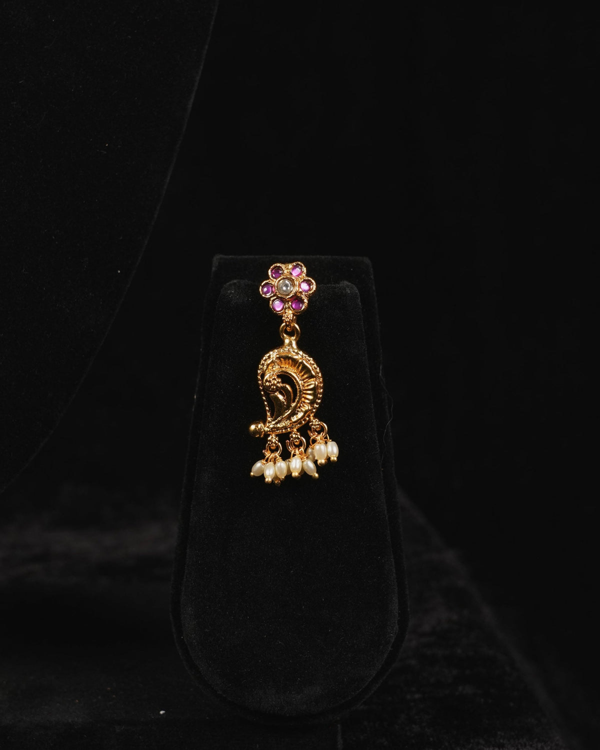 Matching peacock-motif earrings with jhumka drops