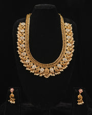 Paired with matching earrings featuring a sculpted peacock and jhumka drop, this set completes your festive and bridal look with a touch of celestial charm. Perfect for weddings, traditional ceremonies, and grand celebrations, this necklace set is a treasure of artistry and devotion.