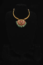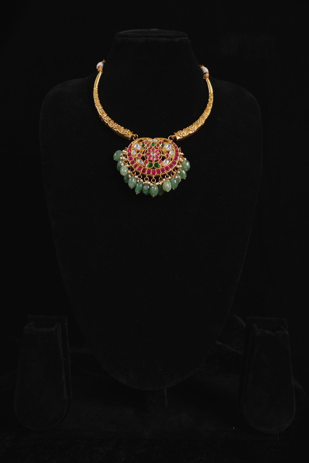 The intricate pendant adorned with hanging green beads adds a captivating touch of elegance, while the finely textured gold-toned chain enhances its traditional charm. Perfectly balanced in design and craftsmanship, this piece stands as a symbol of heritage and sophistication.